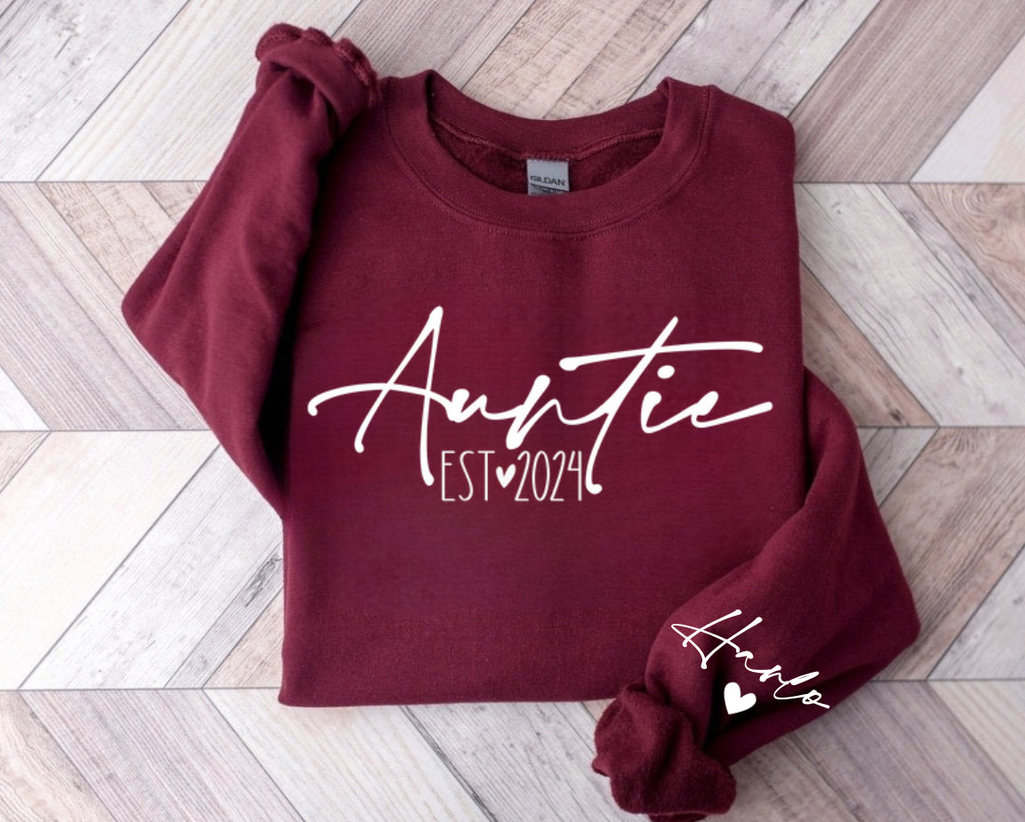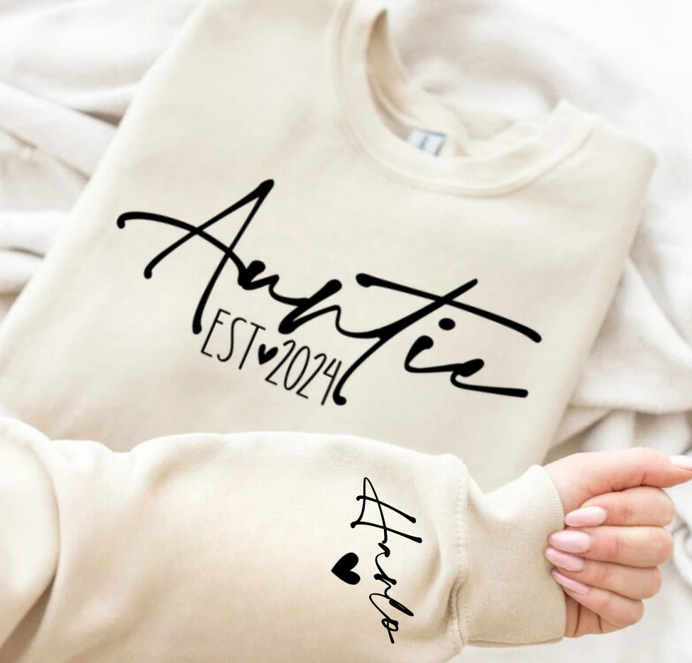 Custom Auntie Sweatshirt with children’s name on sleeve
