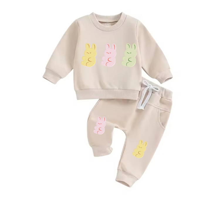 Adorable soft and cozy baby jogger outfit with cute bunnies print on top and matching bunnies print on pants. ❤️