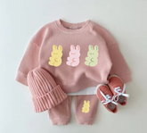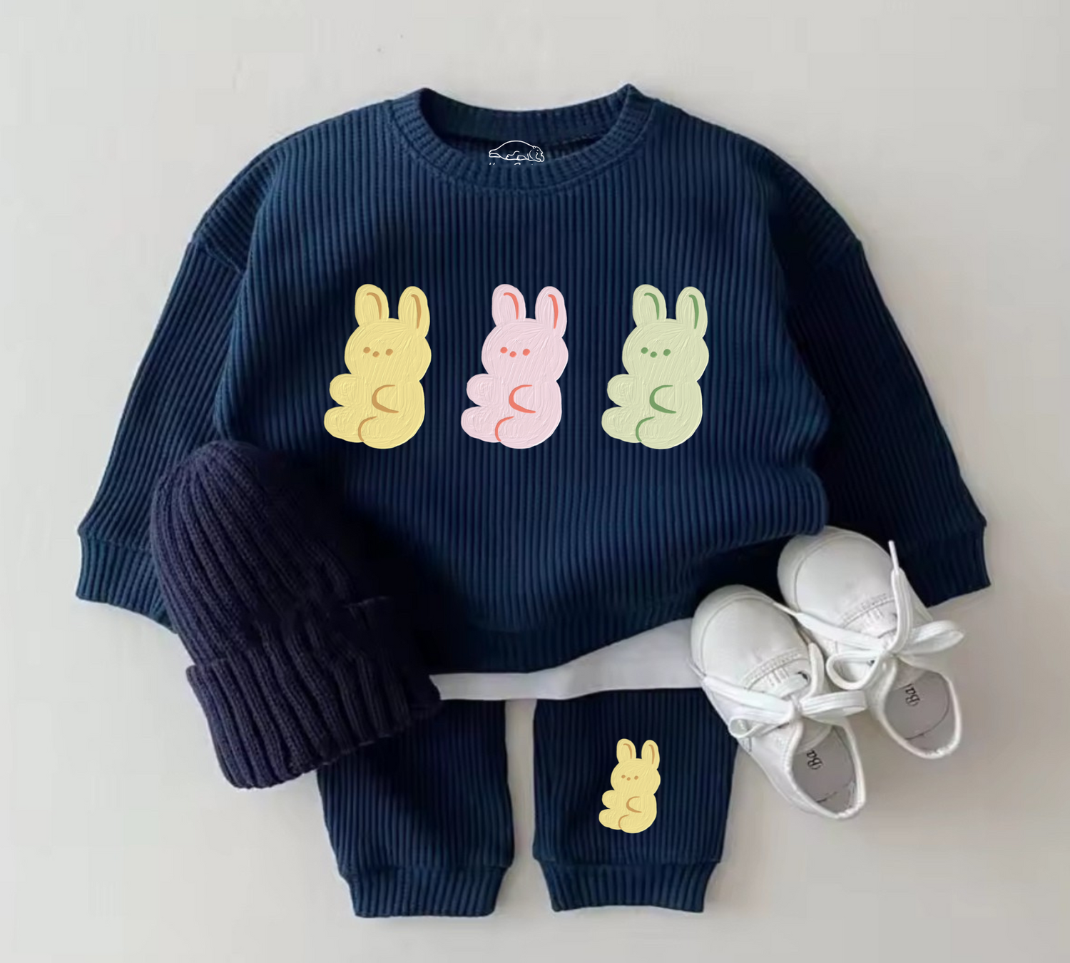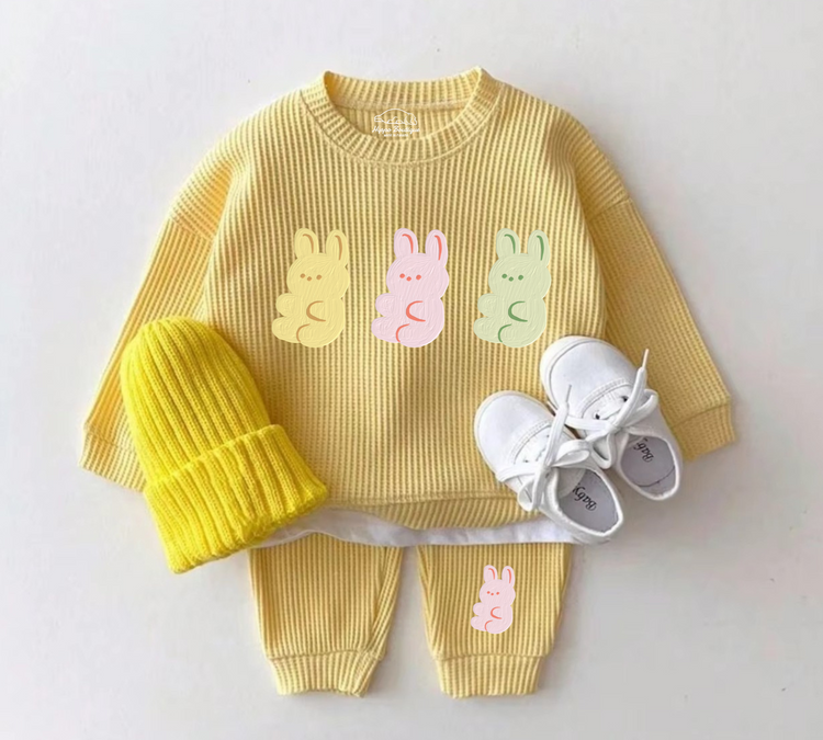 Adorable soft and cozy baby waffle knit outfit with cute bunnies print and matching print on pants. ❤️