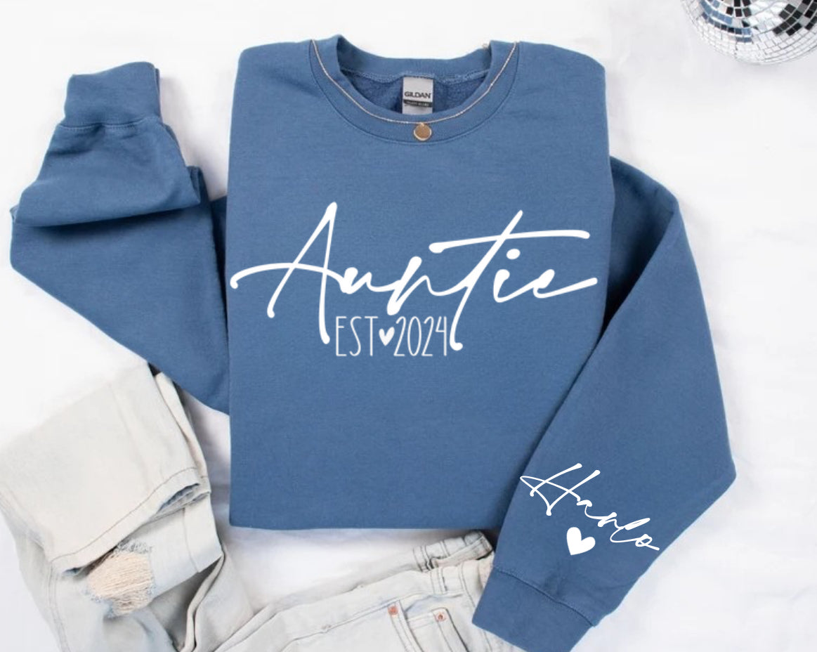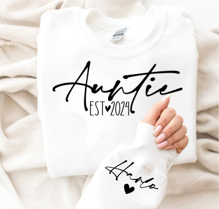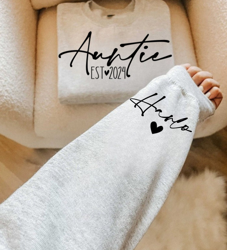 Custom Auntie Sweatshirt with children’s name on sleeve